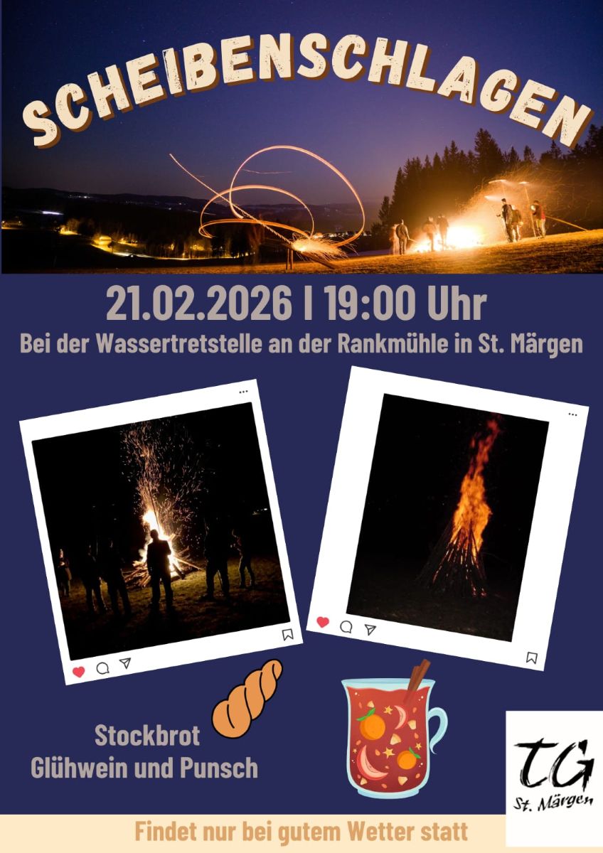 Wir laden euch herzlich zu unserem Scheibenschlagen bei der Wassertretstelle an der Rankmühle in St. Märgen am Samstag, 21. Februar 2026 ab 19 Uhr ein.
